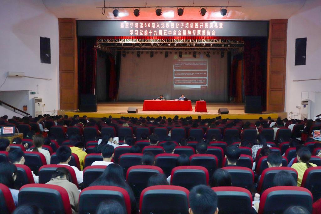 11月25日下午,我校第66期入党积极分子培训班开班典礼暨学习党的十九届五中全会精神专题报告会在德龙会堂举行。学校党委副书记、党校副校长罗任权出席会议并开讲培训班第一堂党课,组织部、党校负责人,875名师生入党积极分子参加了开班典礼及党课。