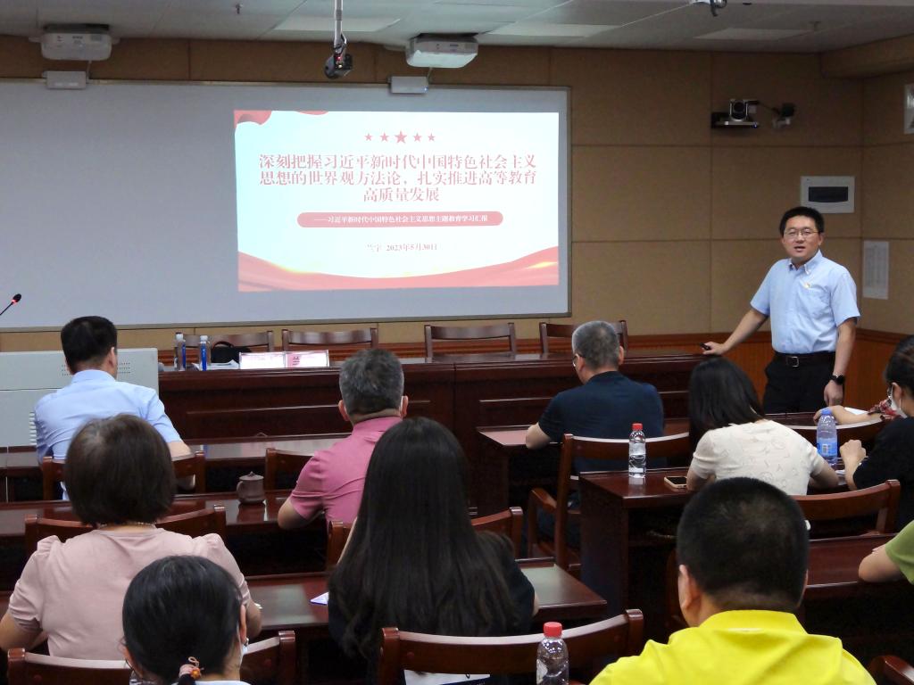 5月30日下午,中山大学帮扶队队长兰宇在成教楼411室以《深刻把握习近平新时代中国特色社会主义思想的世界观方法论,扎实推进高等教育高质量发展》为题讲授主题教育专题党课。继续教育学院、教育科研服务公司与审计处党员30余人参加了专题党课学习。