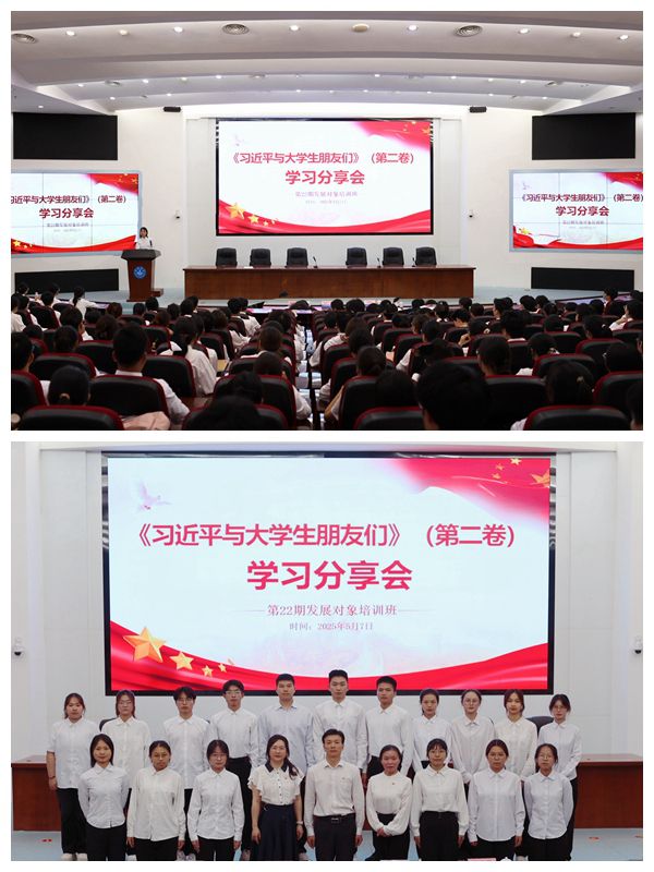 会前,各二级学院组织发展对象集中研读学习了《习近平与大学生朋友们》第二卷。分享会上,各二级学院的发展对象代表围绕书中章节主题,分别讲述了习近平总书记与青年学生的交往故事,将习近平总书记对大学生们的理论指引与学院专业学习、社会实践相结合,生动阐述了青年大学生坚定理想信念、厚植家国情怀的重要意义,感悟新时代青年要将个人发展融入与国家发展大局,在以中国式现代化全面推进强国建设、民族复兴伟业的伟大征程中贡献青春力量、实现人生价值。